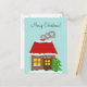 Cozy Christmas cottage house custom winter Holiday postcards for friends and family. Personalizable wishes, name and background color. Cute winter wonderland cabin home covered in snow with chimney smoke hearts, xmas tree lights and red roof. Merry Christmas / Happy Holidays! Also nice for new home, change of address, housewarming party or relocation.
