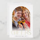 An on trend holiday card design featuring the quote "CHEERS" with combined arch shape for your favourite photo and shiny gold message layered over the bottom.