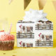 Cute watercolor cow with calf wearing a Santa Claus hat by rustic fence with holiday lights and sign.