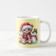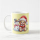 Ceramic Christmas mug with a sweet bear design wearing Santa hat accompanied by a friendly snowman. Its soft-toned background highlights the illustration, creating a cozy and tender style. Ideal for enjoying hot drinks in winter or as a special gift during the holidays.