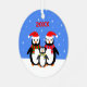 Both sides of this ornament have cute penguins and are ready for your personalisation. The penguins are wearing festive hats and stripey scarves, and snow is falling in the background. On the front of the ornament there is a family of penguins and the year; on the back is a penguin and a name.
