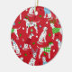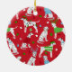 Cute Christmas dogs in festive holiday outfits. Dalmatian with black and white coats wear Santa hats, antlers, sweaters on a holiday background with scattered ornaments.