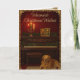 A heartwarming Christmas card featuring a playful Labrador Retriever sitting next to a piano on a cozy rug. A charming scene that captures the festive spirit with elegance and warmth."