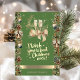 Elegant faux gold Christmas balls, deer, wine glass, Christmas bells, pinecones, and bow on the green background make this a perfect Christmas or holiday greeting card for friends and family.