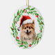 Holiday Christmas tree ornament with a watercolor Pomeranian and watercolor Christmas wreath design. Add the dogs name to the design and it's the perfect gift idea for that puppy dog lover you know, or yourself!