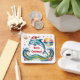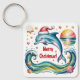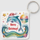 A whimsical birthday card featuring a vibrant watercolor illustration of a playful dolphin wearing a Santa hat, leaping joyfully from a turquoise ocean dotted with shimmering gold stars. The dolphin is surrounded by swirling waves rendered in soft blues and greens, with a subtle gradient of warm pinks and oranges reflecting a tropical sunset in the background, and the text "Merry Christmas!" in a flowing, festive typography is placed elegantly above the dolphin. The card’s layout includes a clean white border to allow space for a personal message, and the overall tone is cheerful and celebratory, perfect for a friend or family member. A subtle scattering of smaller watercolor stars and seashells decorate the interior to complement the design and create a sense of wonder.