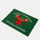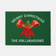 Add an elegant touch to your front door with this personalised Christmas doormat. Colourful and stylish Xmas door mat. A bright red bow with holly leaves and berries brings your Merry Christmas wishes. Your name is below. Bright white text on deep green. You can change the colour of the background and text to red, white blue or any other colour. You can also change the font. You can customise this Christmas doormat template for any holiday event. Unique gift idea for friends, newlyweds or people who have just bought a new home. Editable, personalizable and custom home decor template. Personalizable outdoor home decor. Christmas decorations for your home or office. Available in small, medium and large.