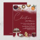 A Christmas party or dinner party invitation. On a festive red background with snow, Christmas foods such as mulled wine, mince pies, ginger bread, Christmas cake and candy canes are displayed.
