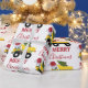 A cute illustration of a Christmas dump truck construction truck vehicle wearing a Santa hat and decorated in Christmas lights with words "Merry Christmas" transporting a festive Christmas tree. Perfect for boys and girls who love construction trucks, toy trucks or heavy machinery. An ideal Christmas wrapping paper for dump truck enthusiasts big or small, girls or boys.