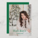 Personalise this simple and elegant holiday card template with your photo and name. Design features "Happy Holidays" in modern elegant script text in white and green on a photo overlay over your favourite photo with festive green colour on back of card
