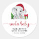 Christmas holiday season sticker for your baby boy shower favours and correspondence featuring "Santa Baby" in a stylish red script with swashes and a cute watercolor of a baby boy elephant with a Santa hat, a Christmas tree, a red and green candy cane and presents. Add the mother-to-be's name and shower date in simple modern typography.