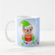 Modern cute green Christmas elf with gift box, Christmas balls, candy cane and star on light blue background Christmas Mug. Name can be personalised.