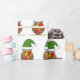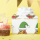 An illustration of a shy happy elf owl with green santa hat and red present with yellow ribbon. This cute cartoon design is a gift idea for owl lovers, bird lovers, and fantasy or magical movie lovers. Are you excited to receive your gift on Christmas?
