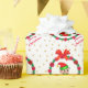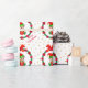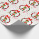 Cute Christmas elf holding a gift box at the centre of a pine wreath ornamented with poinsettias, red balls and golden stars on white background Gift Wrapping Paper.