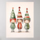 Three adorable Christmas elves dressed in festive green and red outfits, each with unique tall hats decorated with stars, stripes, and winter patterns. Their cute and minimalistic style captures the holiday spirit in a delightful way.