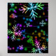 Christmas falling various neon colours snowflakes SlipperyJoe artistic gay pride gifts LGBTQIA dark background vibrant winter vibrant colourful digital illustration blue green pink yellow multicolored bokeh lights festive lively atmosphere depth dimension hanging thin lines black background