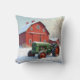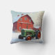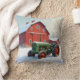 Holiday lights on a classic green tractor stand in front of a vibrant red barn on a snowy winter day