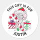 Cute hand drawn whimsical holiday mouse with a Santa hat on sitting in front of Christmas gifts, cute to seal Christmas cards with. To and from gift tag for Christmas presents.