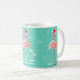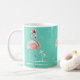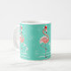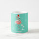 Stylish design with a retro touch featuring a festive pink flamingos wearing red Santa hats, stars and palm trees decorated with baubles set against an aqua background. A customisable design for you to personalise with your own text, images and ideas. An original digital art image created by Quirky Chic.