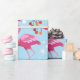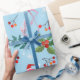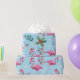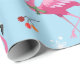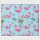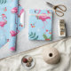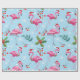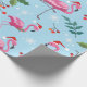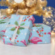 Elegant Christmas flamingos and holly pattern on a light blue background, perfect for creating beautifully wrapped gifts.