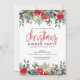 Red roses winter foliage and pinecones Christmas floral border frame. Customisable Christmas dinner invitation.