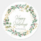 This design features an illustration of green and golden foliage, red berries in watercolor style