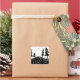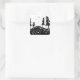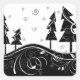 black and white decorative graphic image with Christmas trees and stars in a forest