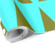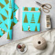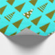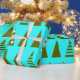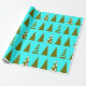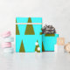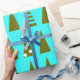 A modern pattern of white geometric trees, some with snow white ornaments...all on an aqua blue background.