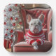 A French Bulldog wearing a red and white striped sweater sits elegantly on a red tufted chair in front of a decorated Christmas tree