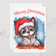 A cute frenchie - dog wearing a red Santa hat is depicted with a playful expression, surrounded by snowflakes. The backdrop has a festive and wintery theme that complements the dog's cheerful demeanour.