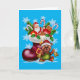 Santa`s red boot filled with christmas toys and treats, with a cute happy teddy bear ringing christmas bells, a magical christmas card for all ages.