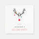 A funny, cute modern minimalist image of a reindeer head with a red nose. With Christmas ornaments, baubles hanging from the antlers. No background colour, Colours: white, red, grey, blue, green. Red text: Holiday Party. Template for your family name and year, text in blue green and black.
