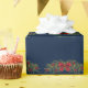 Destei's original illustration of a festive green fir tree garland that is decorated with a big red bow, red Christmas baubles and some faux lights. The background colour is dark blue. There are also two personalizable text areas.