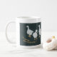 A stylish white coffee mug with three Christmas Geese on a black background with gold and silver lettering, from a handpainted design by Judy Adamson. Matching greeting card also available.