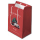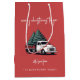 A festive Christmas present gift bag featuring the cheerful heading “Merry Christmas to you” in modern handwritten white script typography paired with a vintage-inspired Christmas tree delivery truck graphic. Designed on a red background, this stylish retro bag combines nostalgic charm with a modern minimalist layout. Personalize the “with love from” section and underneath with your family name in complementary typography for a warm, custom touch. Perfect for presenting holiday gifts and packages, this fun and classic design adds personality to your wrapping while spreading festive joy. A timeless Christmas bag ideal for families, small businesses, or seasonal gifting.