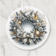This gift tag is shown with a festive holiday wreath print in colors of silver and gold.