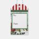 Christmas gift tags with a cardinal and pine boughs, red and white stripes and green band.