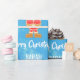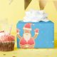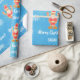 Modern Christmas gift wrap for kids, with a minimalist design that includes a gingerbread figure of Santa, snowflakes, the greeting "Merry Christmas" in stylish typography, and a personalised name. On a blue background with snowflakes.