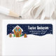 This cute and festive address label features a cute gingerbread house decorated with pink and green candy. Beside it are adorable gingerbread men with gifts, dressed in Santa hats and a scarf. In the background is a navy blue winter sky with elegant falling snowflakes. This is perfect for Christmas and the winter holiday.