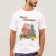 A festive t-shirt to wear for the upcoming holidays featuring a watercolor design of a gingerbread house tucked into a bough of evergreens with red berries and a red bow.
