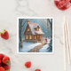 A whimsical gingerbread house is nestled in a snowy forest, illuminated warmly from within, as a snowman waits on a stone pathway