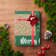 Modern Christmas giftwrap for kids with the words "Merry Christmas" in stylish typography, a personalised dedication now reading "To Amber / with love / from Santa," snowflakes, and a pattern with reindeer, Xmas trees, baubles, snowflakes, Santa, snowmen, gingerbread men, stockings, and gift boxes. On a green background.
