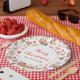 This elegant and festive plate features a watercolor gingerbread house, gingerbread train, cake stand, cookie jar, hot cocoa, red poinsettia flowers and Christmas trees. The text combines handwritten script and sans serif fonts for a stylish and modern look. This is perfect for Christmas parties.