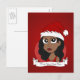 with an illustration of beautiful young African American woman with wavy hair and Santa Claus' hat; with editable text template, Christmas holidays design on a red background, by Radka Kavalcova