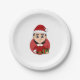 Design with an illustration of a cute smiling happy girl with short black hair, she is wearing red and white Santa Claus costume and holding a present; Christmas holidays design with a white background