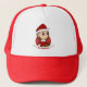Baseball hat with an illustration of a cute smiling happy girl with long brown hair, she is wearing red and white Santa Claus costume and holding a present; with editable text template for your name or message, Christmas holidays design