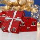 with an illustration of beautiful young African American woman with wavy hair and Santa Claus' hat; with editable text template, Christmas holidays design on a red background, by Radka Kavalcova
