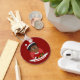 Keychain with an illustration of a cute smiling African American girl with an Afro hairstyle, the girl is wearing a Santa Clause costume with a red hat and holding a present; in a red circle on a red background, with an editable text template for your name or message
