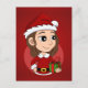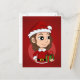 A postcard with an illustration of a cute smiling girl with long brown wavy hair, the girl is wearing a Santa Clause costume with a red hat and holding a present. On a red background.