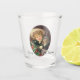 1.5 oz. shot glass with a vintage 1940s image of a little girl standing in the snow, bundled up in a Christmassy coat and hat. She holds a holly wreath and umbrella with one arm and an adorable puppy with the other. Optional text. See matching paper plate and coasters. See the entire Holiday Shot Glass collection in the FOOD/BEV | Dishes section.